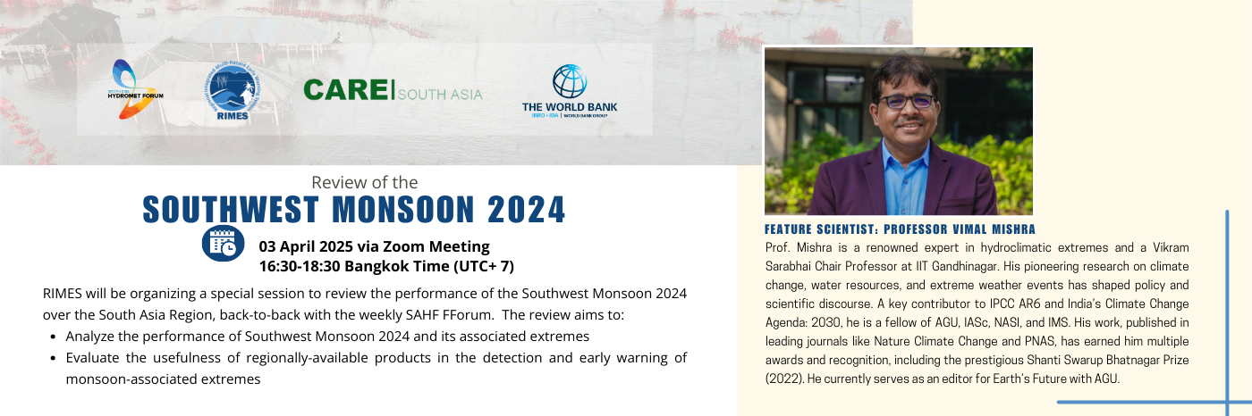 RIMES will be organizing a special session to review the performance of the Southwest Monsoon 2024 over the South Asia Region, back-to-back with the weekly SAHF Forecasters’ Forum.