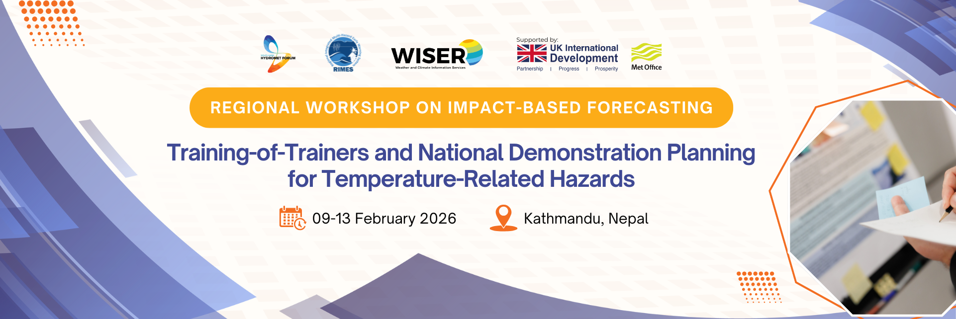 The workshop aims to strengthen the capacity of National Meteorological and Hydrological Services (NMHSs) in South Asia to design, operationalize, and communicate Impact-Based Forecasts for temperature-related hazards. It will follow an end-to-end IBF approach, guiding participants through the full IBF process, from forecast generation and interpretation, to impact analysis, trigger and threshold development, action-led warnings, and effective communication and dissemination.